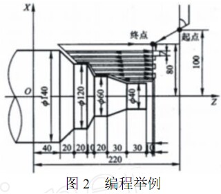 數(shù)控編程是數(shù)控加工的重要步驟。數(shù)控程序編寫(xiě)如何將直接關(guān)系到程序的質(zhì)量、 效率和機(jī)床的利用率。通常 ,數(shù)控編程分為手工編程和自動(dòng)編程兩種。一般形狀簡(jiǎn)單、 計(jì)算量小、 程序不多的零件適合用手工編程 ,而計(jì)算量大、 手工編程困難或根本無(wú)法用手工編寫(xiě)的程序用計(jì)算機(jī)來(lái)完成。在計(jì)算機(jī)及自動(dòng)編程軟件被大量使用的今天 ,手工編程因其經(jīng)濟(jì)、及時(shí) ,在點(diǎn)位加工或由直線與圓弧組成的輪廓加工中 ,仍被廣泛使用。因此 ,在編程過(guò)程中 ,使用復(fù)合固定循環(huán)指令 ,不僅可以縮短程序段的長(zhǎng)度 ,減少程序所占內(nèi)存 ,同時(shí)對(duì)于手動(dòng)數(shù)據(jù)輸入 (MDI) 方式來(lái)說(shuō),也會(huì)節(jié)約大量的時(shí)間,提高機(jī)床的利用率。本文以數(shù)控車(chē)削加工中廣泛使用的復(fù)合固定循環(huán)指令 G70和 G71為例,介紹它們的程序段格式及參數(shù)的含義,并舉例說(shuō)明該指令的具體應(yīng)用。