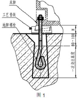 基礎(chǔ)二次灌漿分兩次進(jìn)行 將按比例混合好的細(xì)砂 水泥灌入二次澆注坑內(nèi) 上部預(yù)留80-100mm高度空間 圖1 控制H值 按鐵鐵的最小高度值加1-2mm便于安裝機床本身的調(diào)整墊鐵 并用小型振動棒夯實 固化養(yǎng)生3-4天