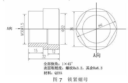 工件的定位和夾緊是相互聯系非常密切的兩個工作過程。工件定位以后必須采用一定的裝置把工件壓緊夾牢在定位元件上,使工件在加工過程中部不會由于切削力、工件重力、離心力或慣性力等的作用而發生位置變化或產生振動,以保證加工精度和安全生產。 本夾具上工件的夾緊利用了工件自有的右旋 M30×1.5 螺紋, 采用鎖緊螺母如(圖 7)作為受力元件進行人工夾緊。