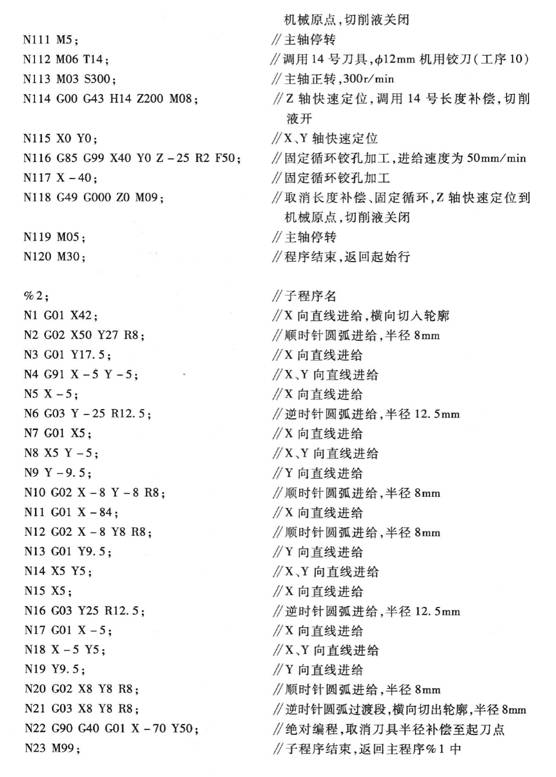 用木錘或銅棒敲擊工件,使平行墊塊不能移動后夾緊工件。利用尋邊器找正工件X, Y軸零點,使之位于工件對稱中心位置。設置Z軸零點與機械原點重合。刀具長度補償利用Z軸定位器設定(有時也可不使用刀具長度補償功能,而根據不同刀具設定多個工件坐標系零點進行編程加工)。工件上表面為執行刀具長度補償后的Z零點表面。