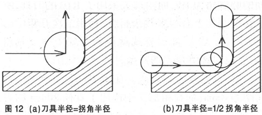 在數控高速切削加工中, 刀具軌跡拐角的處理是十分重要的, 因為即使切削深度很淺, 進給速度和走刀軌跡的劇烈變化也是造成刀具破損的重要原因之一。 為避免這種情況, 應調整進給速度, 從而調整每一個刀刃的切削量( 圖 11) , 在圖中的拐角處, UG NX3.0 采用了分步減速的方法。同時要避免刀具軌跡的劇烈變化( 圖 12) , 圖中的圓角如果用等半徑的刀具直接加工, 如圖 4- 12 ( a) 所示, 則進給方向發生突變勢必會使機床負荷猛然增加, 所以, 加工這種類型的圓倒角最好是使用較小半徑的刀具, 一般情況下刀具半徑最好為圓倒角幾何尺寸的 70%或更小, 這樣可使拐角處的切削刀具進給方向變化平滑, 避免刀具的突然轉向, 見圖 4- 12b) 。使用小直徑刀具加工和直接切入拐角相比,機床負荷可以降低 3 倍左右。